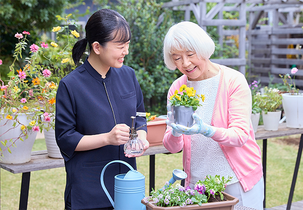 お客様と接する機会が一番多い介護スタッフ。 自立の方から要介護の方まで、さまざまなお客様と深く関わっていきます。 お身体に触れる仕事なので、少しでも嫌な思いをされないよう、少しでも気持ちの良いケアを提供できるよう、 お客様の気持ちを汲み取ることが求められます。 そのために大切なのは、日々のコミュニケーション。言葉はもちろん、お話が苦手な方は、ジェスチャーや目で気持ちを訴えかけてくることもあります。 それらをきちんと受け取り、お客様の心に寄り添ったケアを行います。